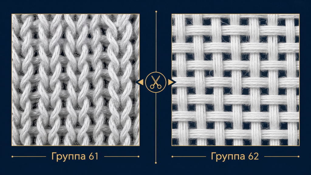 Вязаное полотно или тканое — вот развилка, которая отправляет партию в разные ветки номенклатуры. Трикотаж уходит в группу 61, все что сшито из ткани — в группу 62. Дальше внутри каждой ветки деление идет по доминирующему волокну.